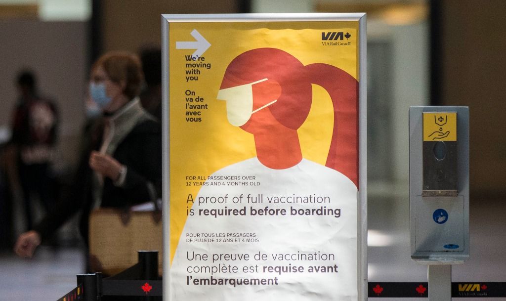 5月11日,在加拿大多伦多一座车站,一名戴口罩的女子从提醒人们乘车前出示疫苗接种证明的告示旁走过。新华社发(邹峥摄)